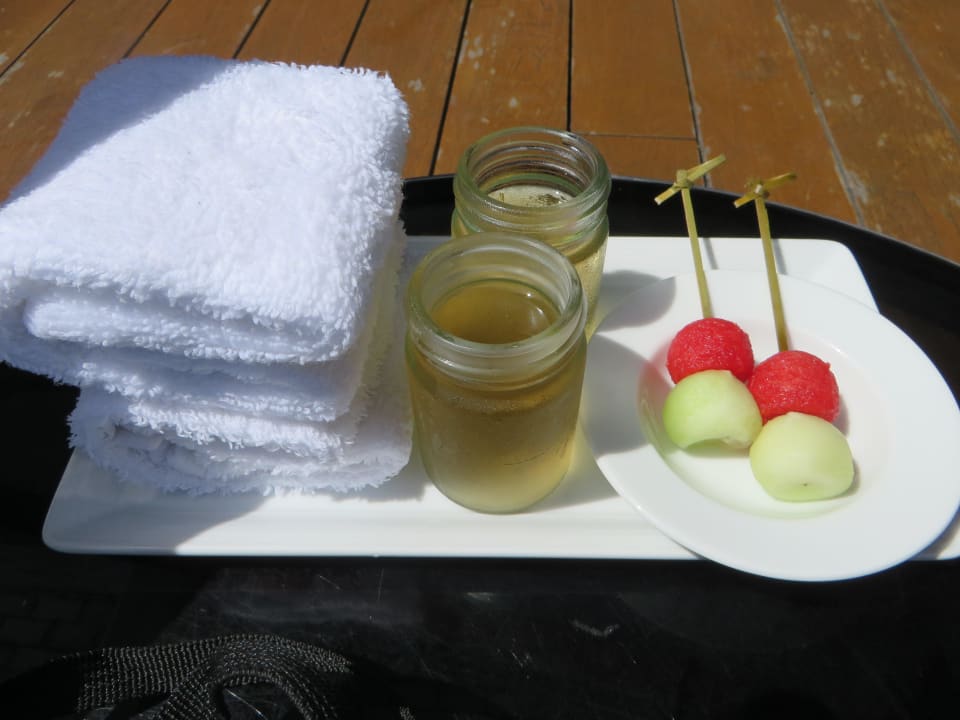 Kalte Tücher, Obst und Lemeongras Tee