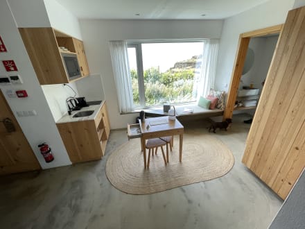 Kleine Kochzeile mit Tisch und Sitzbank. Utensilien zum Kochen müssen an. Der Rezeption geholt werden