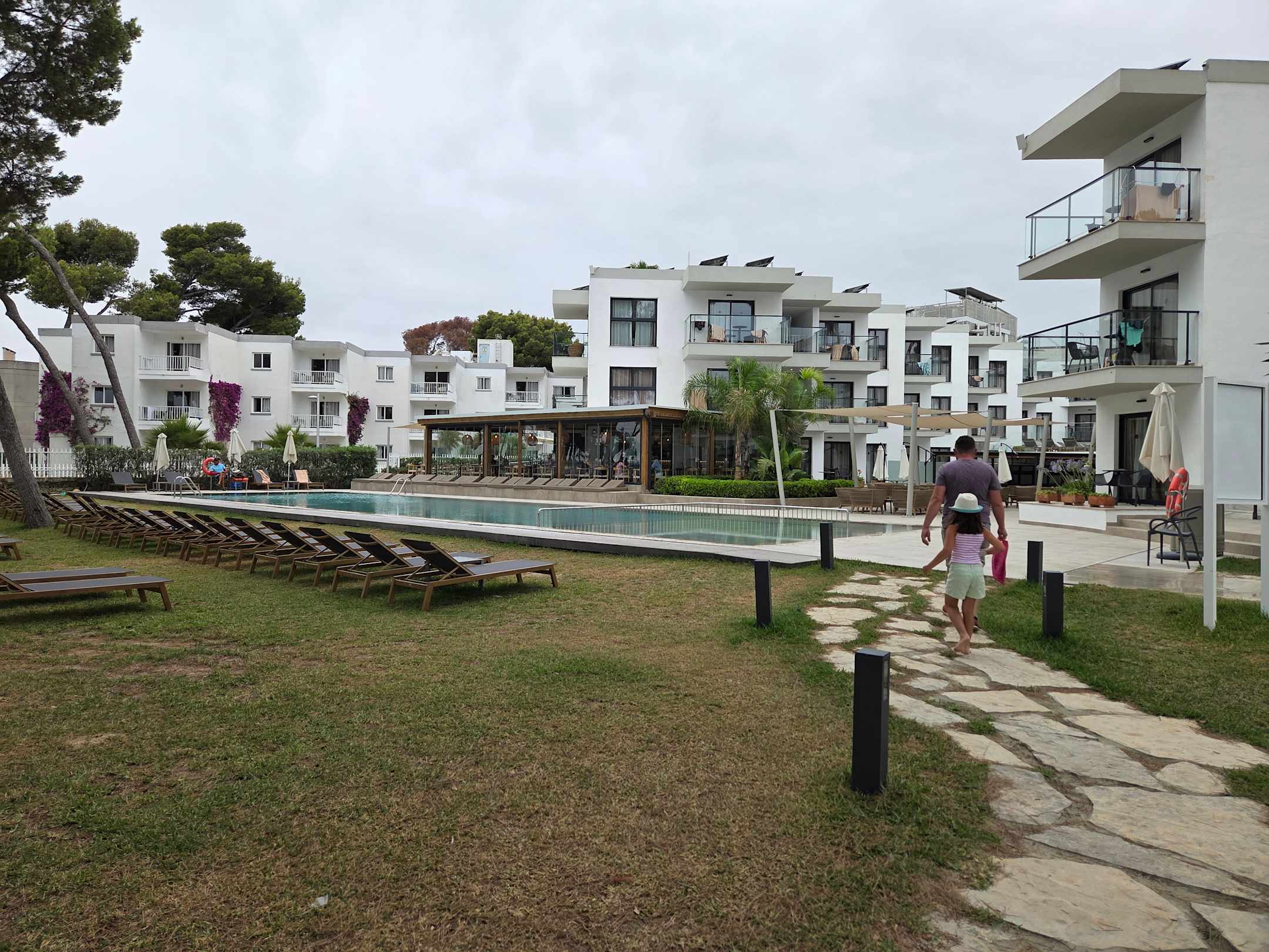 Blick auf Poolbar und Gartenanlage mit Pool und kostenfreien Liegen