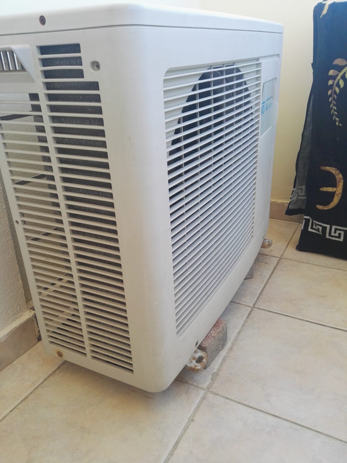 Balkon,Klimakompressor steht auf Pflastersteinen