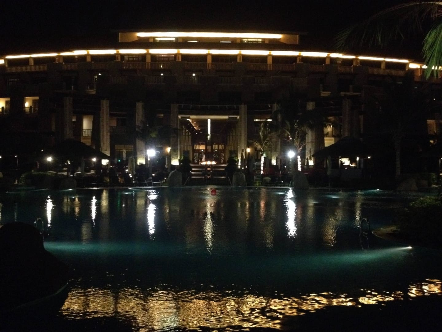Poolanlage bei Nacht mit Blick auf Hauptgebäude