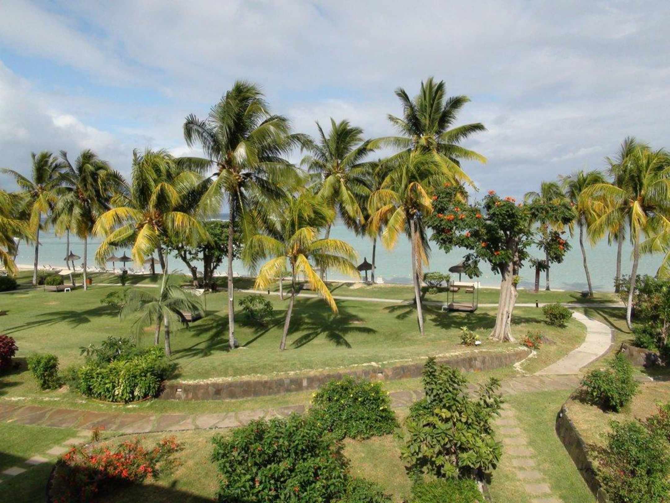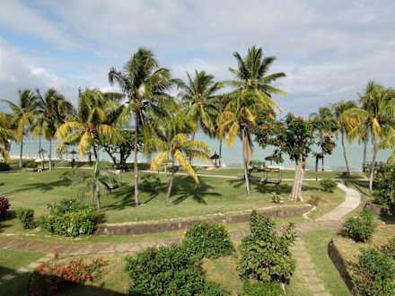 Blick vom Hotelzimmer zum Hotelgarten und Strand