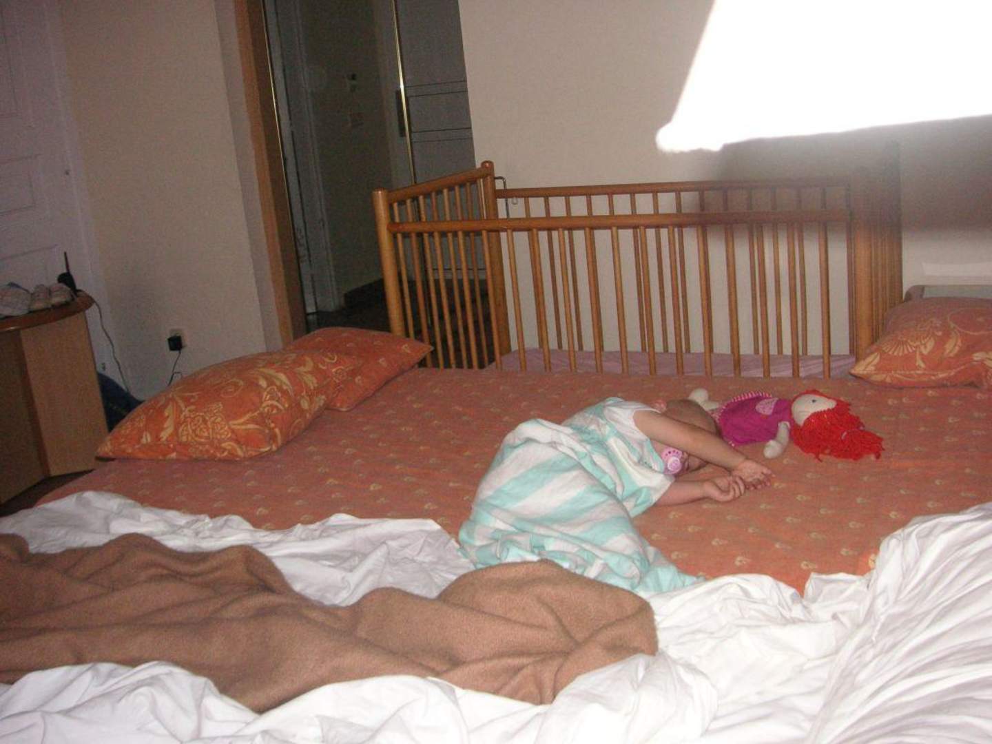 Babybett im Zimmer und Baby im grossen Bett