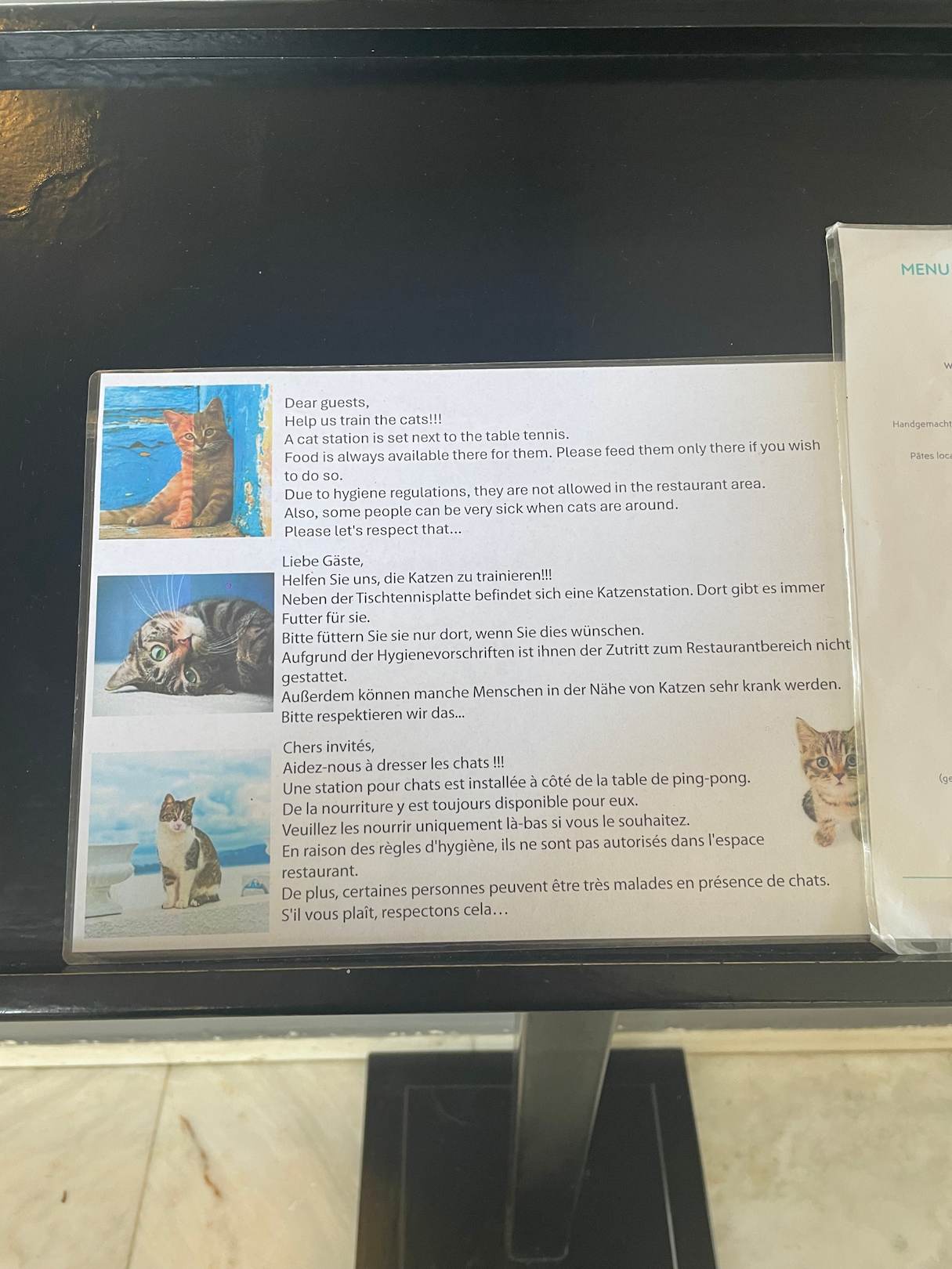 GastroFinde ich gut das man die Katzen nicht füttern soll da sie nur an einer Stelle im Hotel gefüttert werden. Deshalb betteln sie auch nicht.
