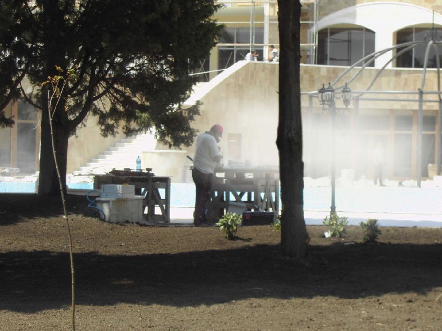 Steinarbeiten den ganzen Tag .wer mit seinen Kindern im Bereich Kinderpool-Garten lag,bekam es ganz schön auf die Ohren.