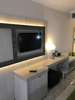 TV, Kaffeebar, Kühlschrank unten links.