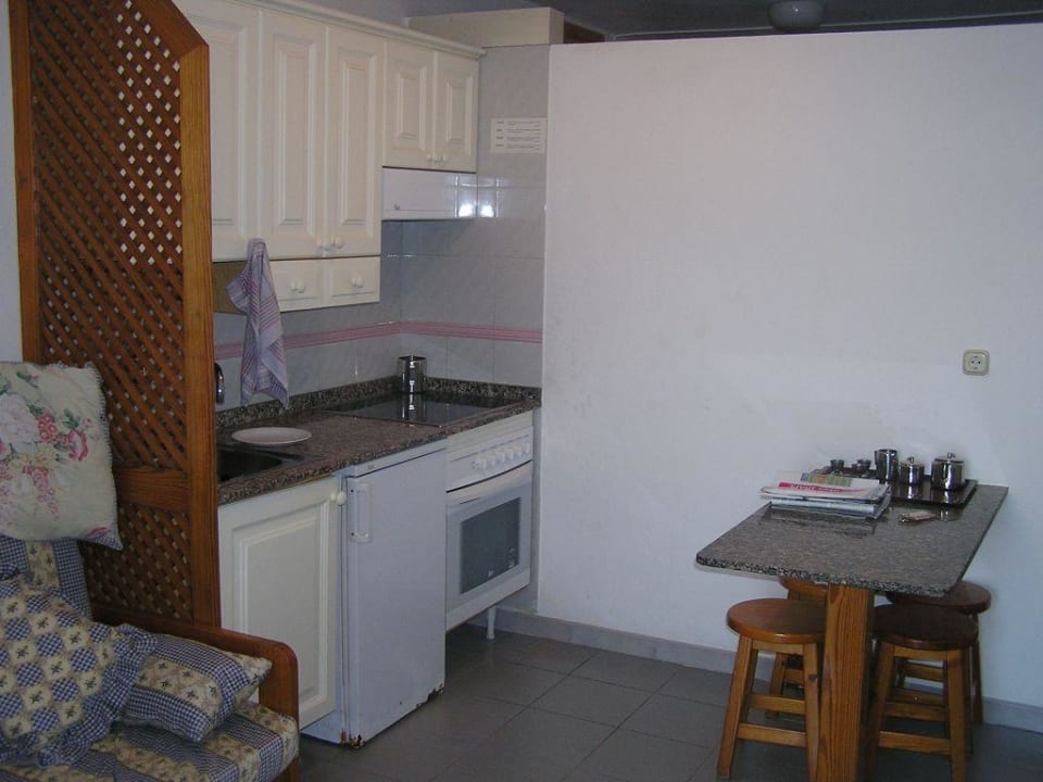 Die Kochecke im Studio. Hinter der weißen Wand am Tisch, befindet sich der Schlafbereich.