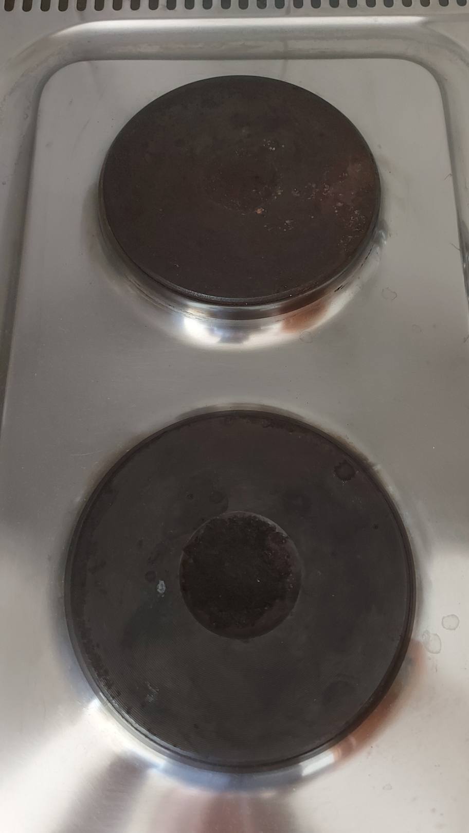 Küchenzeile mit eingerosteten Elektroplatten. Kein Geschirr.