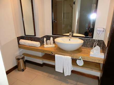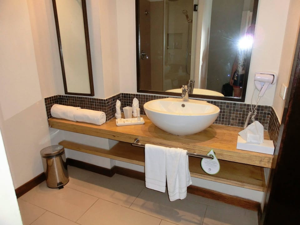 Badauf Fotos sieht es von weitem modern aus, wenn man davor steht ist es ein dickes Holzbrett mit Waschbecken und Ablage.