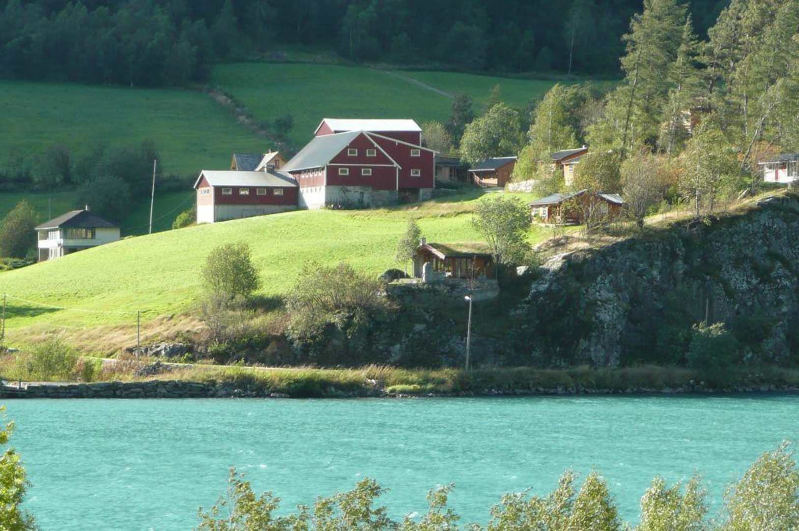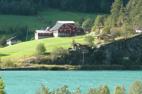 Solberget HytterBlick vom anderen Ufer des Oldevatnet auf den Bauerhof und die Hütten. Unsere Hütte war die im Vordergrund (am Abhang)