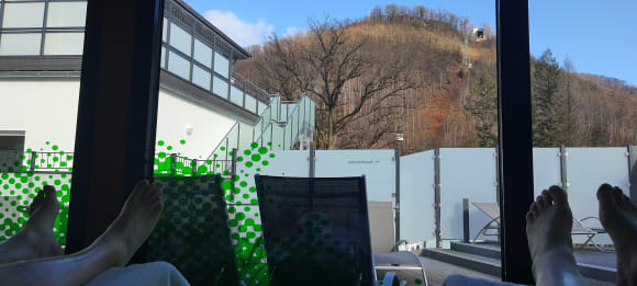 Ruheraum in der Therme mit Blick auf Seilbahn