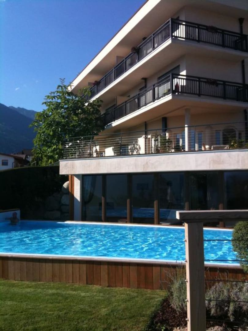 Pool und Hotel von der Gartenseite