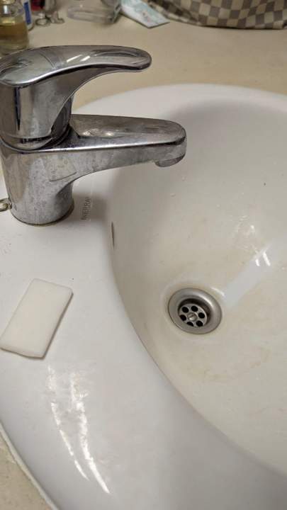 ZimmerEin mickriges Stück Seife, das aus der Zeit gefallen ist. Waschbecken: den Streifen habe ich gemacht, um den Schmutz zu verdeutlichen.