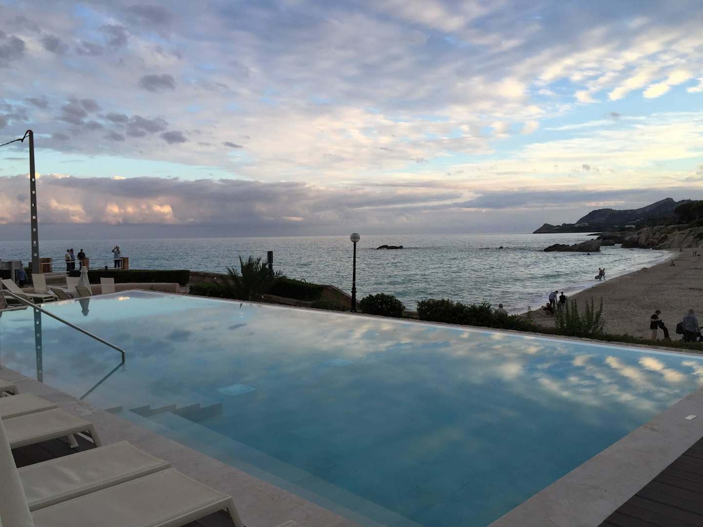 Blick vom Pool auf Strand und Meer