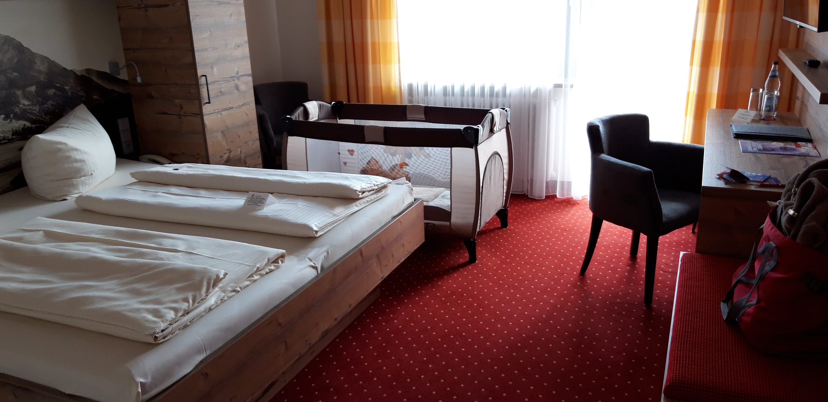 Babybett war bereits aufgestellt bei unserer Ankunft. Standardzimmer mit Balkon