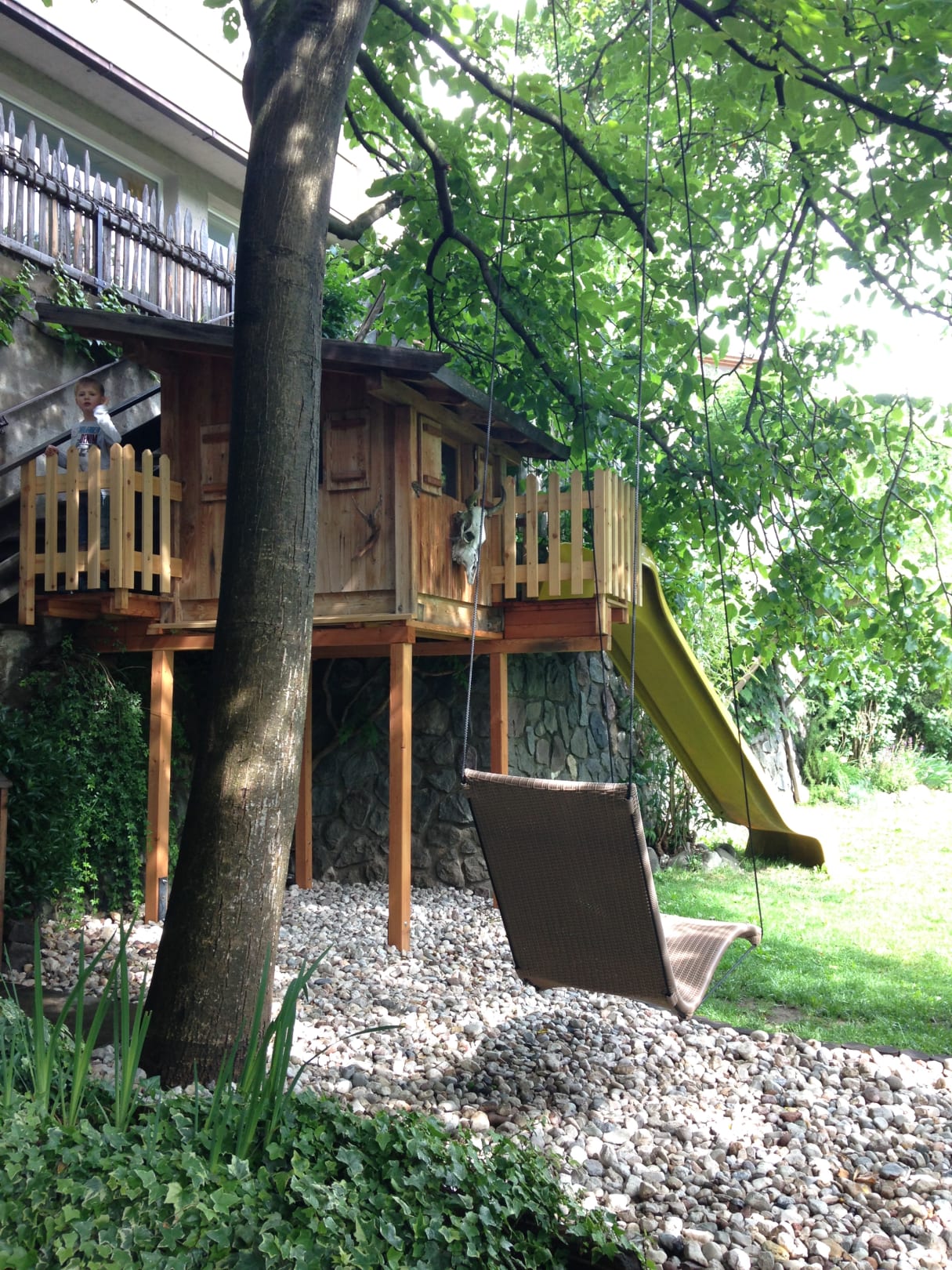 Kinder spielen - Eltern schaukeln in aller Ruhe im Garten