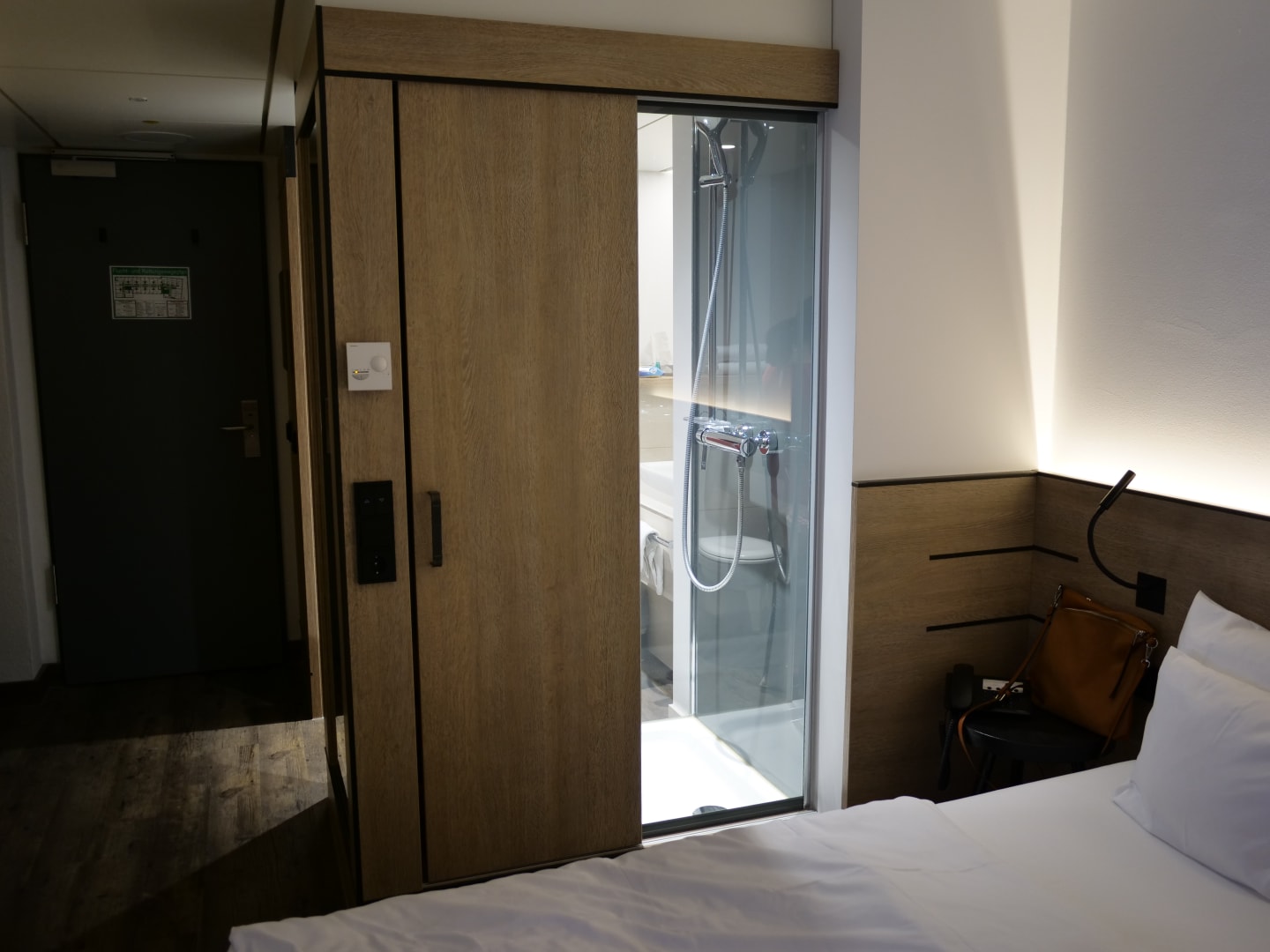 ZimmerEs gibt vom Bett aus ein Schaufenster zur Dusche, welches man öffnen und schließen kann ;-)