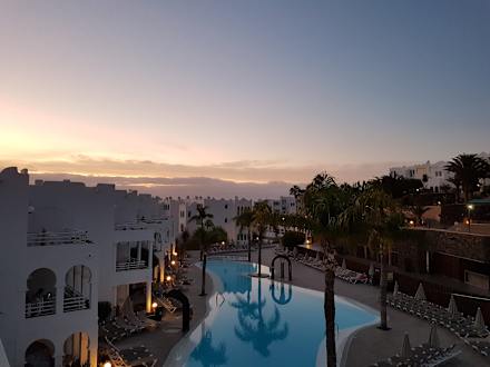 Der Blick von unserem Balkom (2.OG) über die Poolanlage Richtung Meer/Strand.