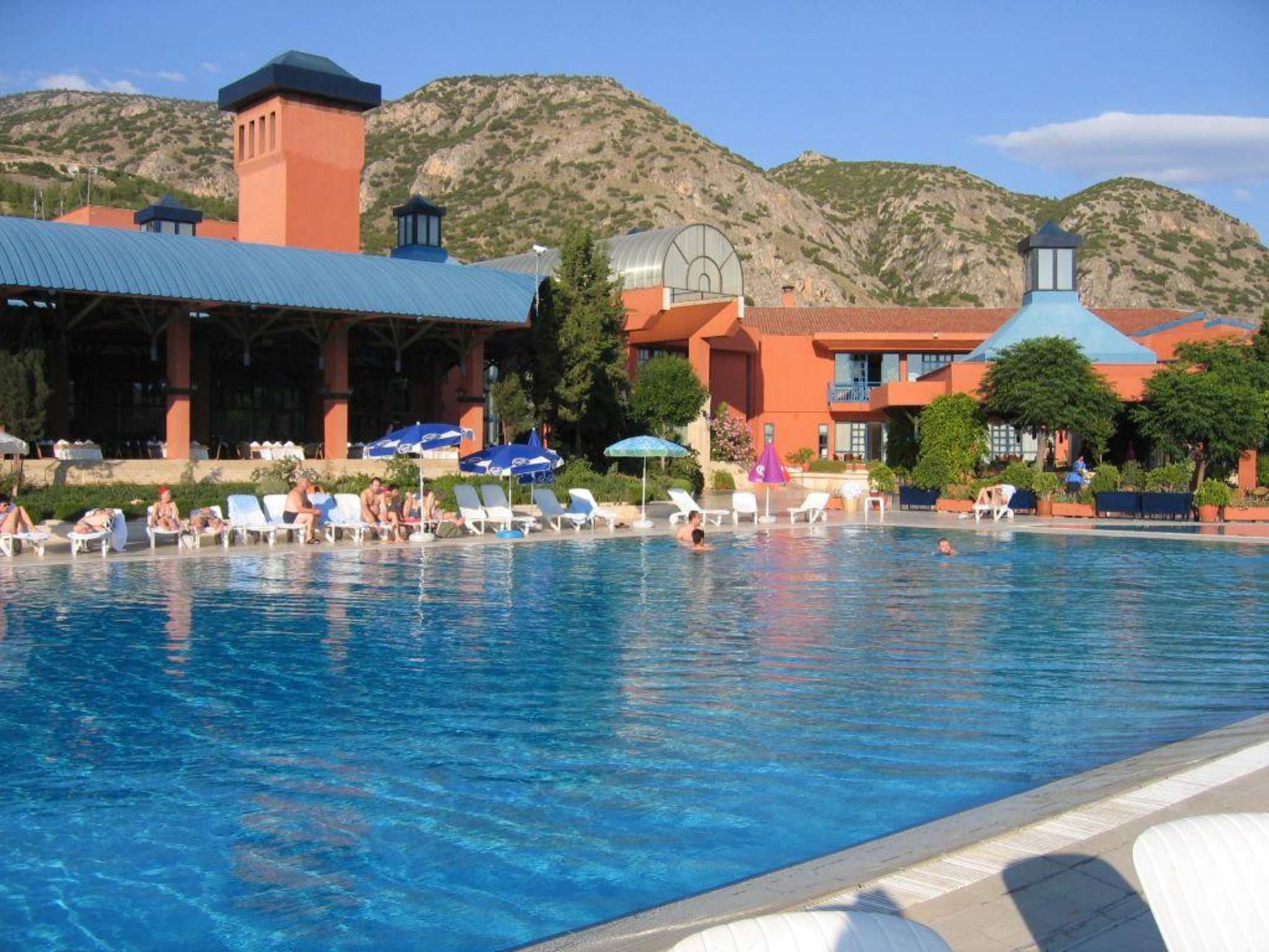 Pool, dahinter offenes Restaurant. 5-Sterne-Hotel in Pamukkale.