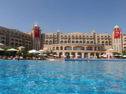 Blick auf das Hotel vom Pool aus