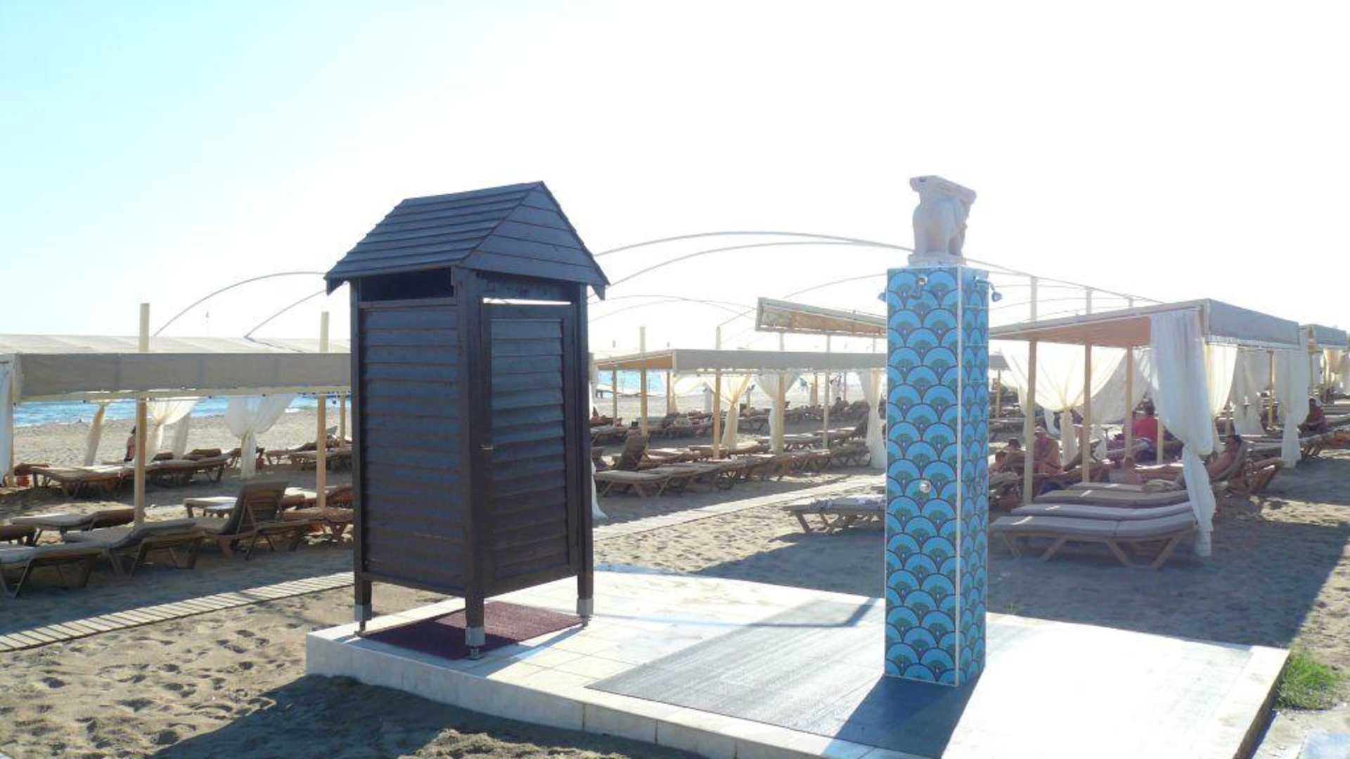 Strand mit Liegen, Umkleide und Dusche