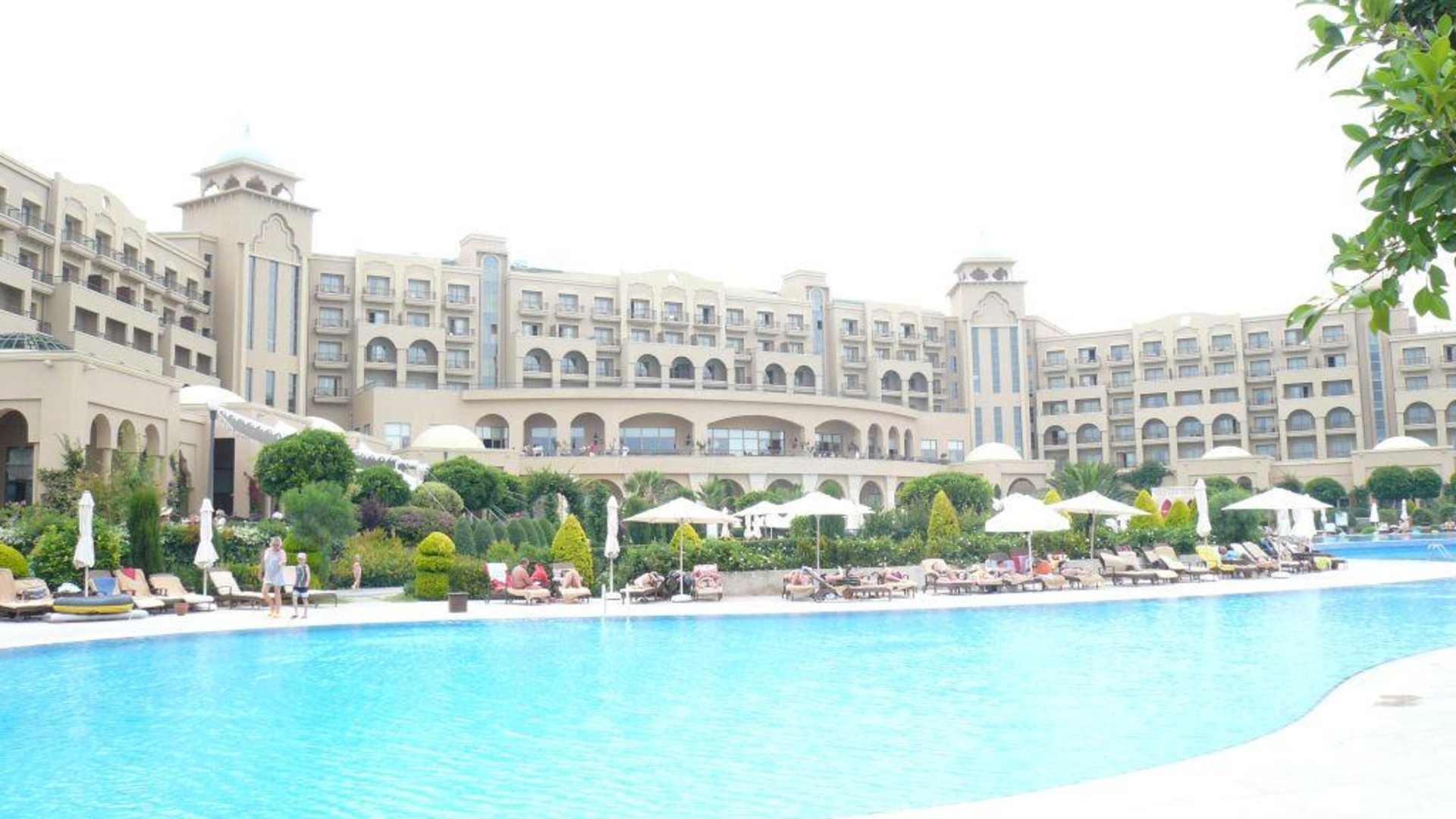 Blick über den Pool auf das Hotel