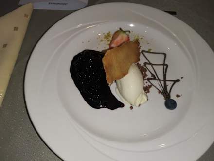 Nachspeise am 7. Abend: Topfeneis mit warmen Heidelbeeren, Hippengebäck
