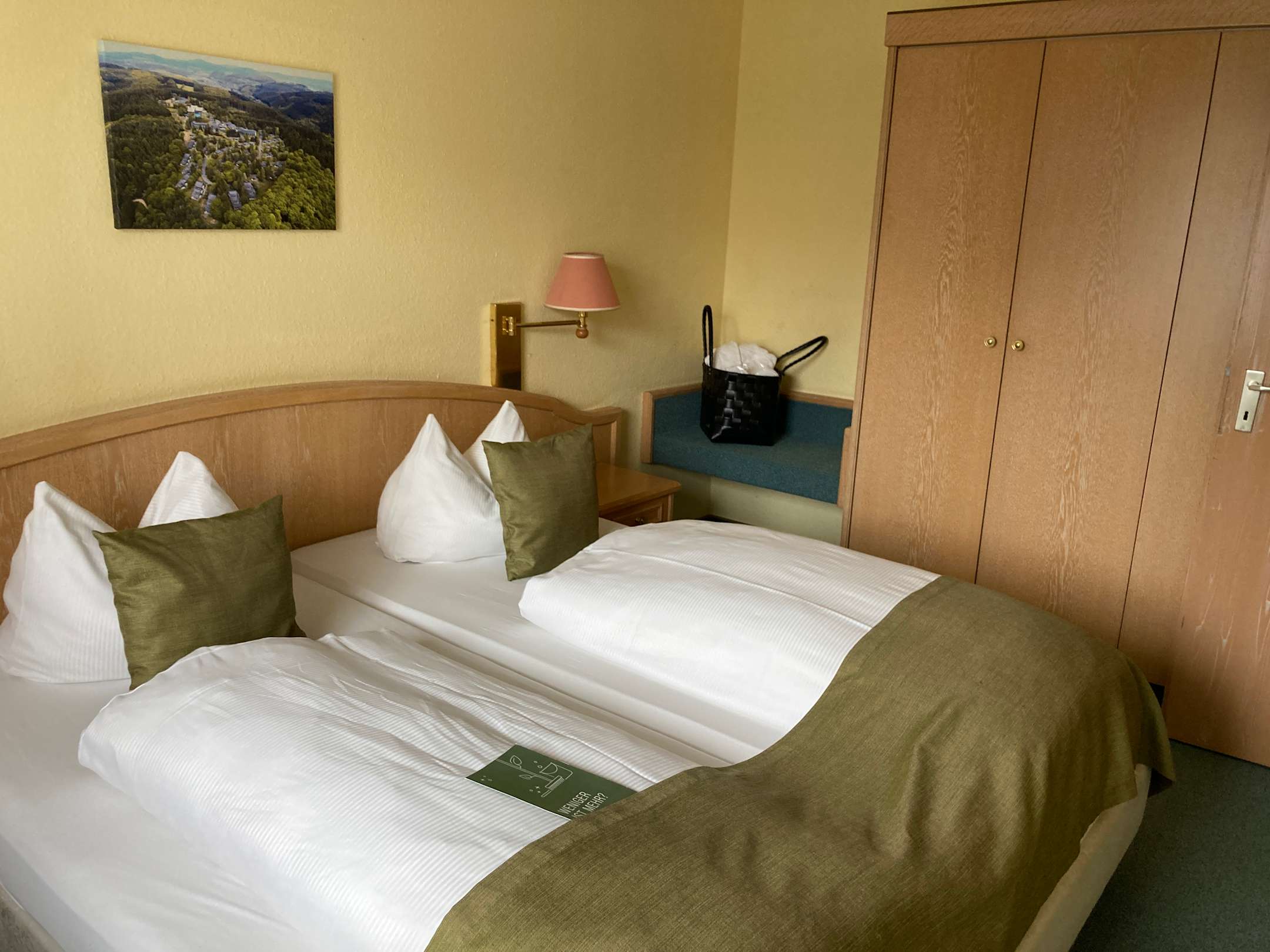 Schlafzimmer mit Tasche voll Bademänteln und Schlappen