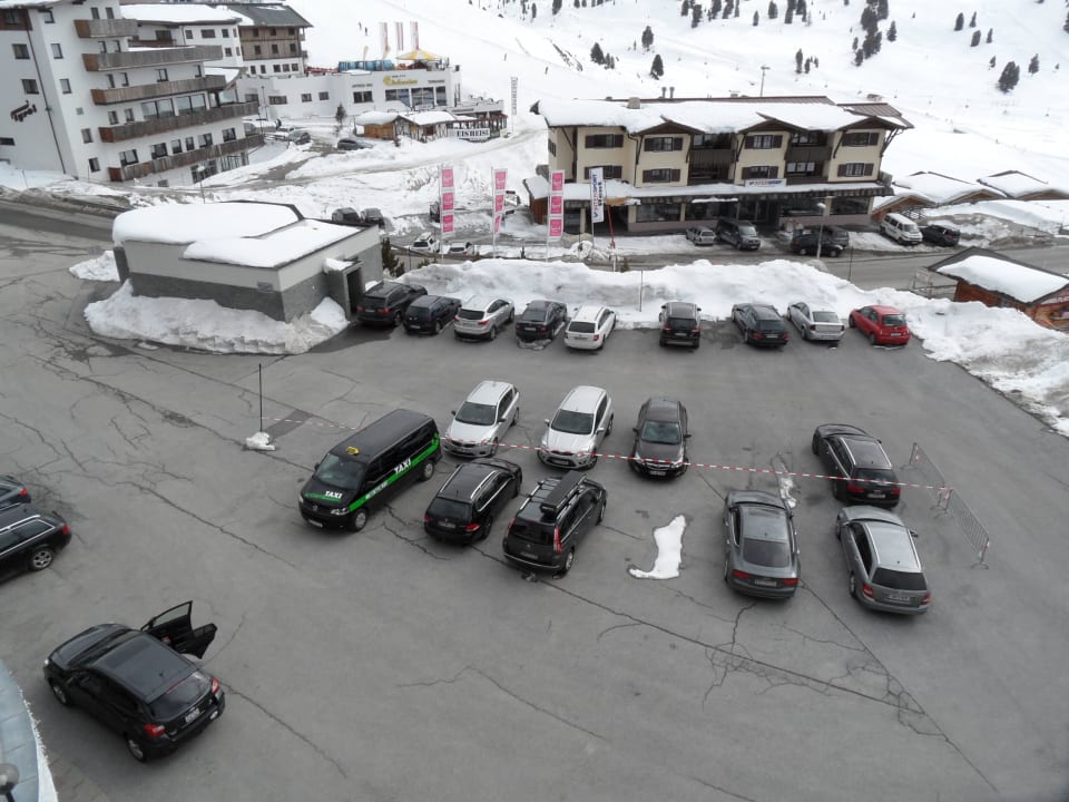 Blick auf den ParkplatzDer, unserer Meinung nach, ausreichend große Parkplatz mit der Bar S'Iglu und im Hintergrund dem Sportgeschäft.