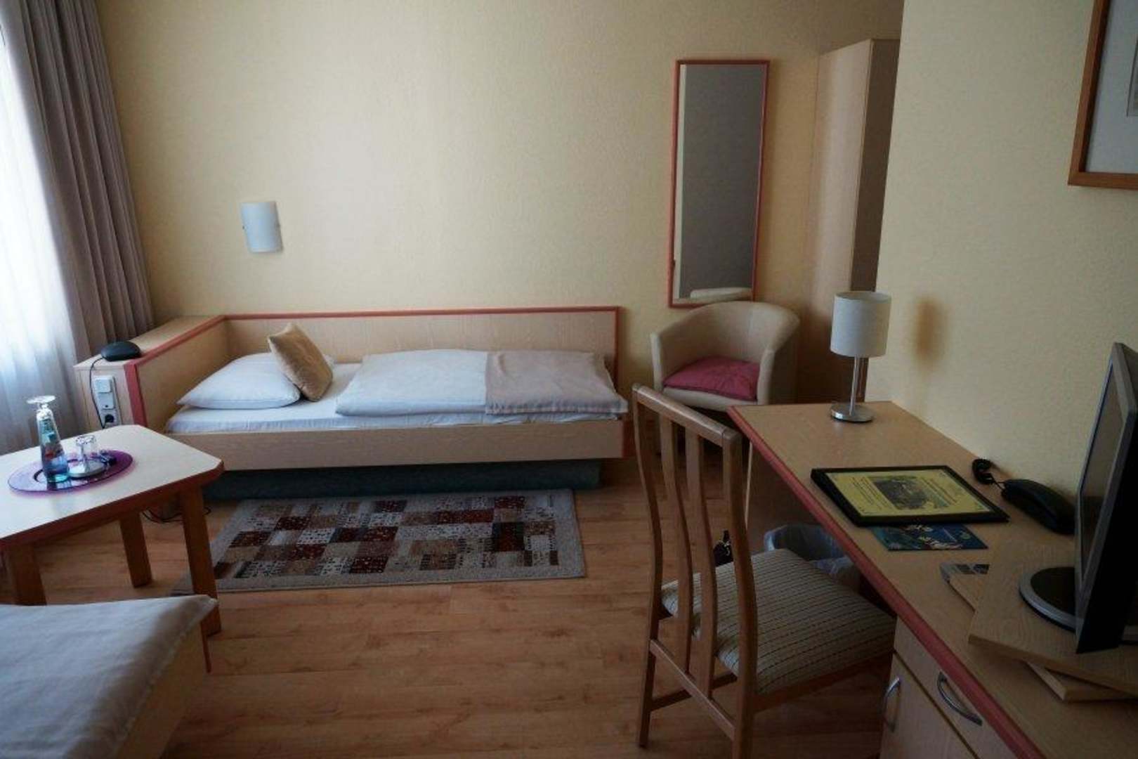 Schreibtisch und 1. Bett