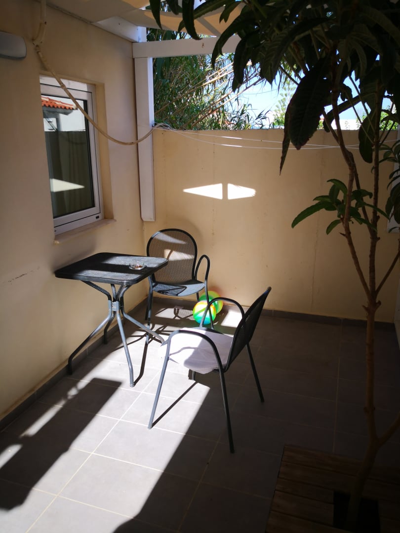 Dunkle kleine Terrasse mit 2 Stühlen bei 3 Personen
