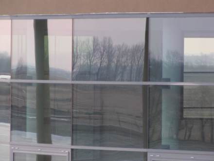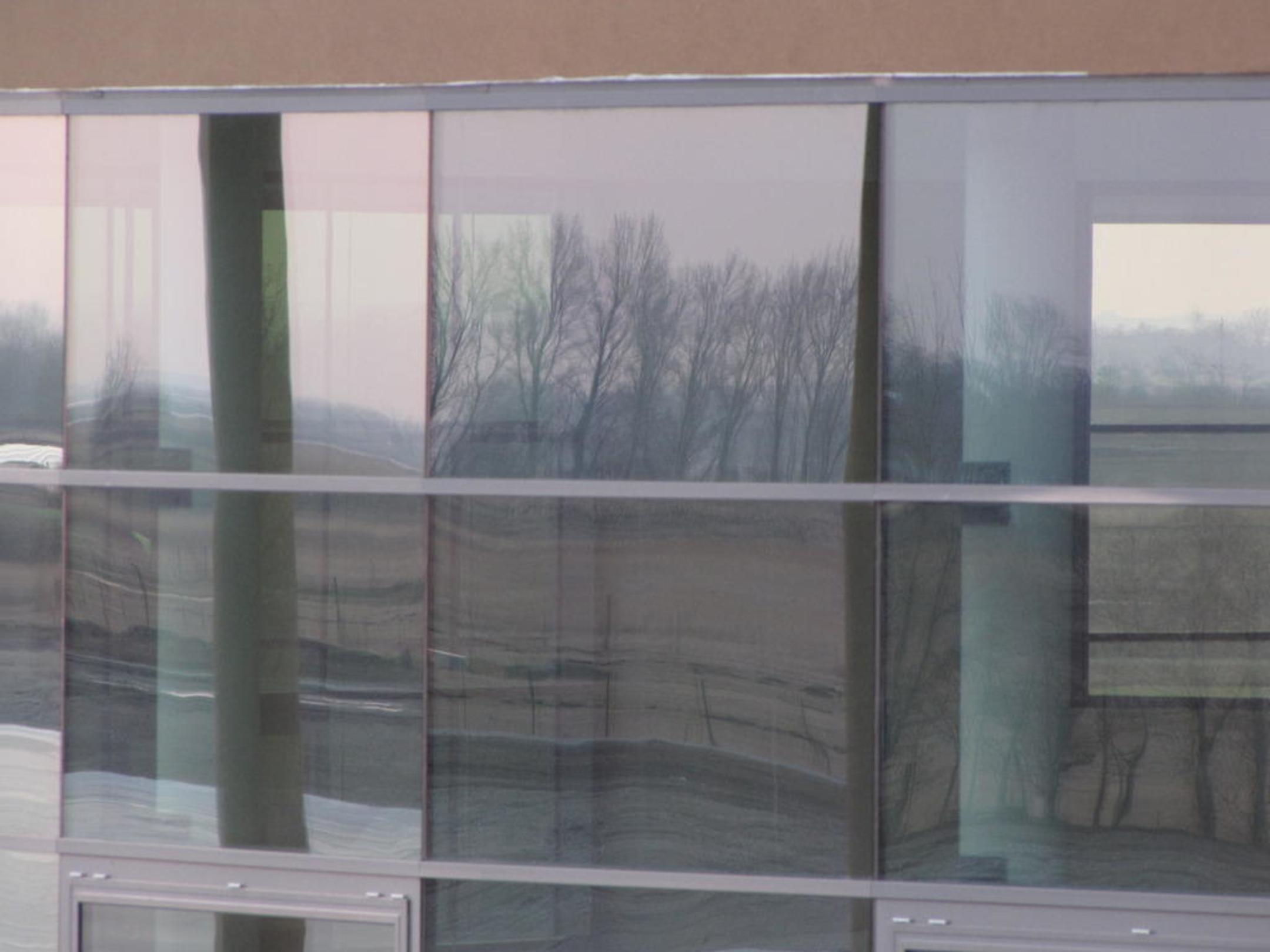 In den Scheiben der öffentlichen Therme spiegelt sich die Landschaft gegenüber