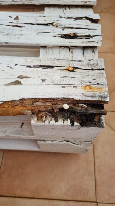 Palettenmöbel auf Patio. Enorme Verletzungsgefahr.