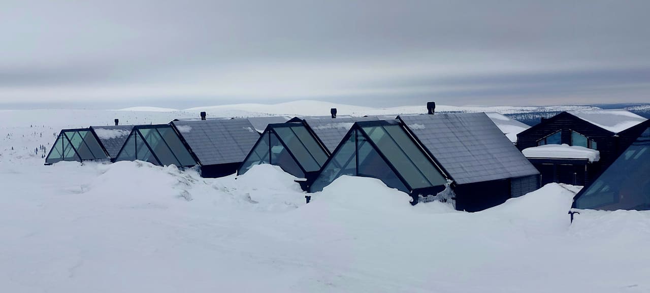 AußenansichtDie Aurora- Hütten auf dem Gelände des Hotels. Das Glasdach ist beheizt, sodass immer einer freier Blick auf den Himmel möglich ist.