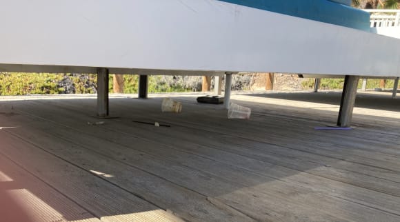Müll unter den Liegen am Steg, der nicht verräumt wird und vom Wind ins Meer weht