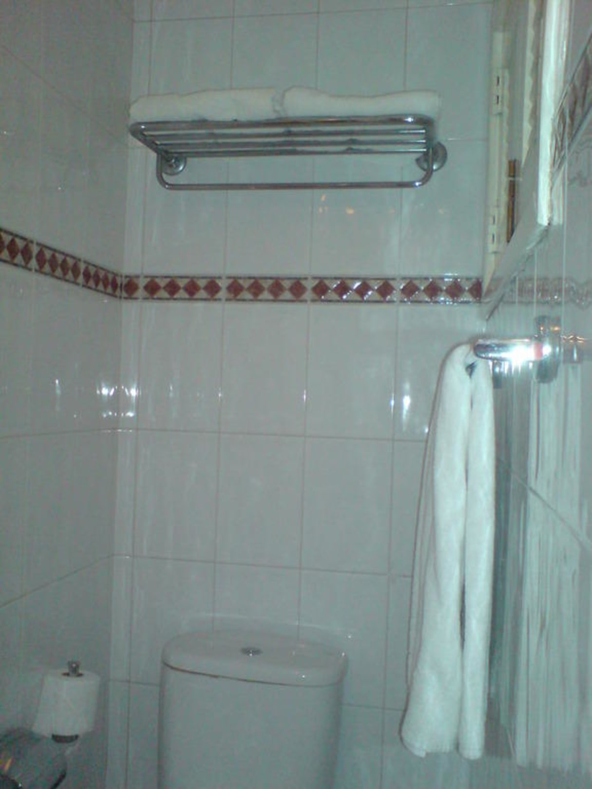 BadBad mit Toilette und darüber die Ablage für die Handtücher.