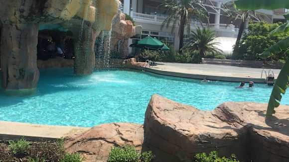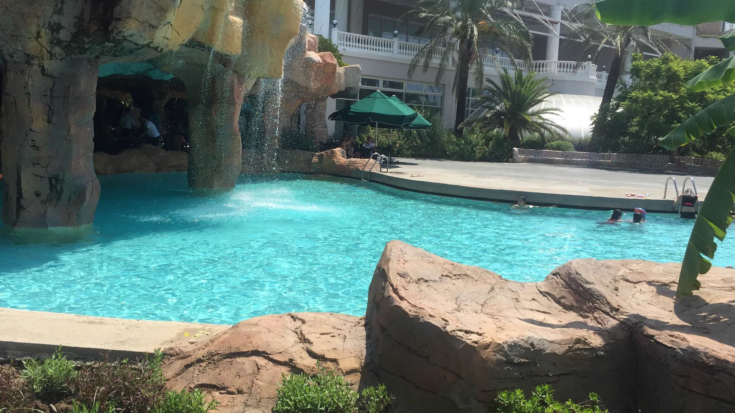 Sicht zum Pool und vom Pool aus zum Strand