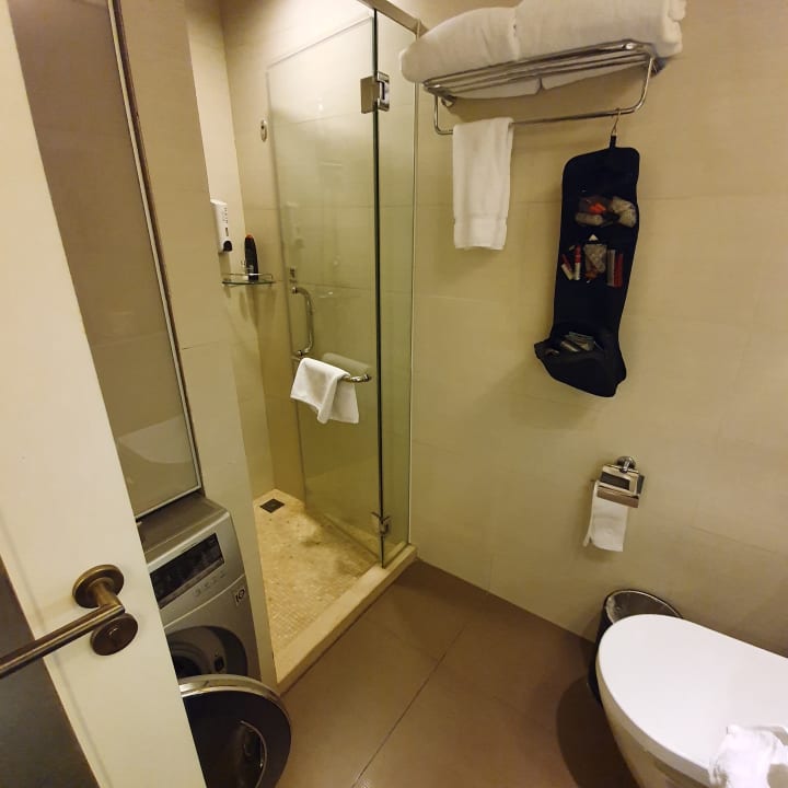 Badezimmer mit Dusche und Waschmaschine