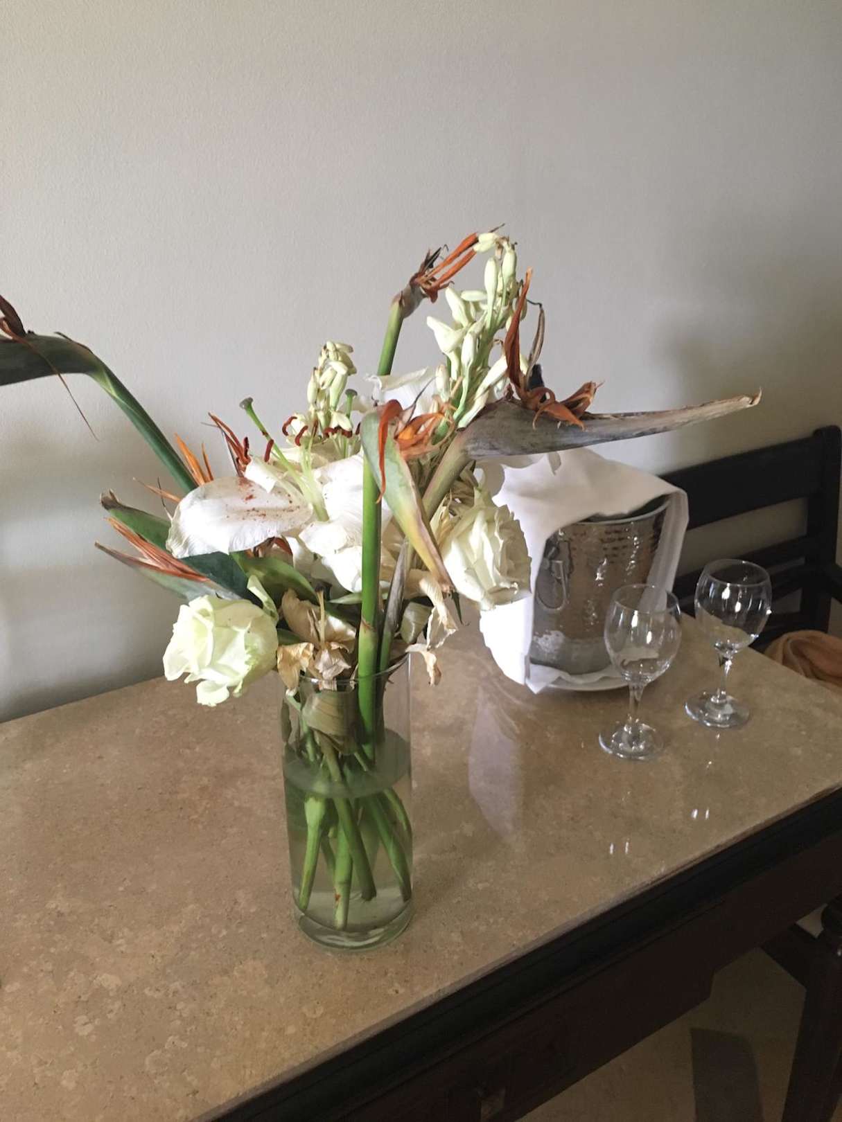 ZimmerMeine Unfallentschädigung, eine Flasche Wein und dieser verwelkte Blumenstrauß der mir bis zum Ende der Reise erhalten blieb, wie man sieht.