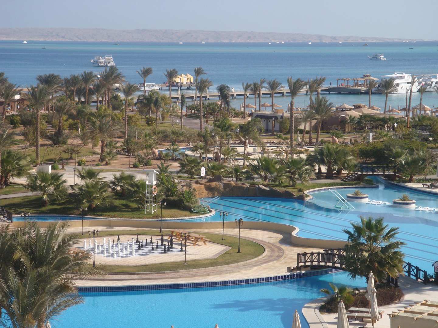 Der Blick über die Poollandschaft und das Schachbrett
