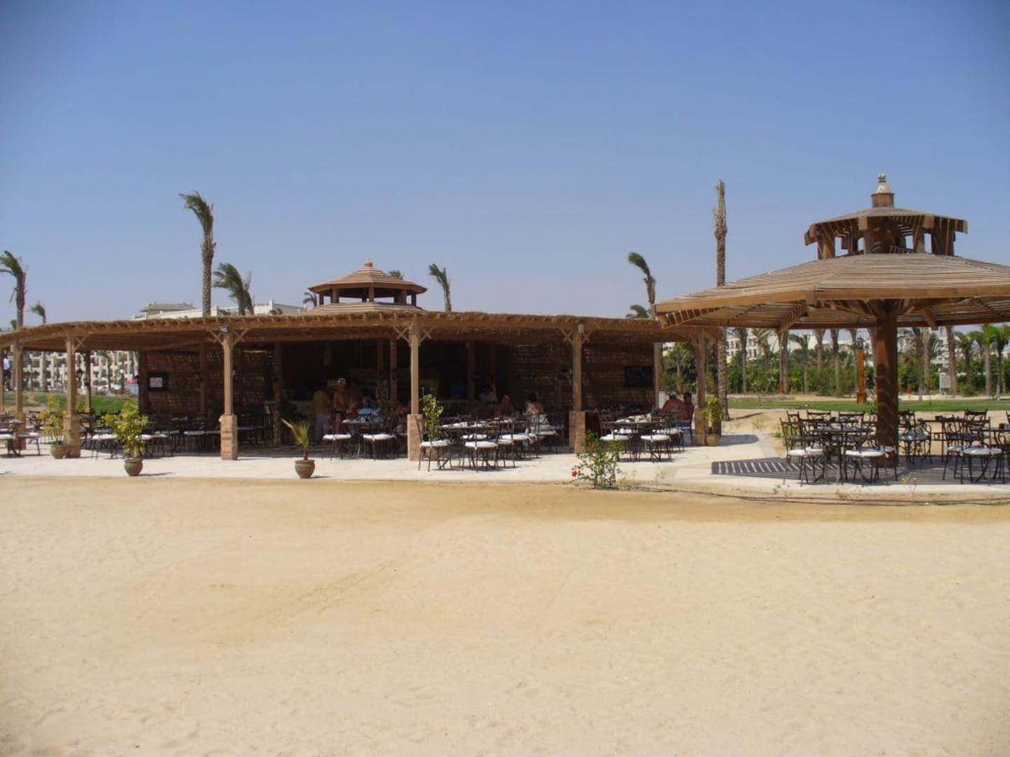 Blick vom Wasser zum Strandrestaurant