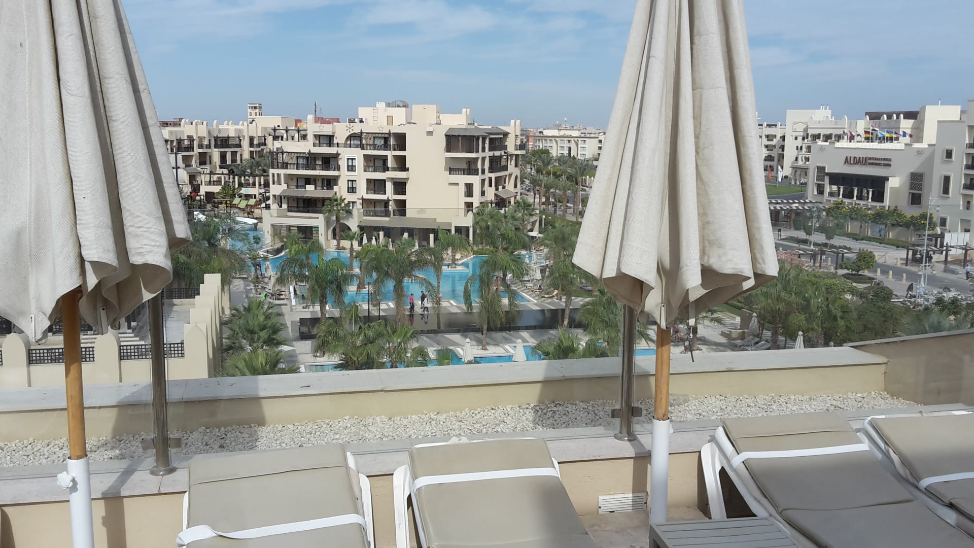 Blick von der Adults Only Area auf die Poolanlage Richtung Piratenschiff