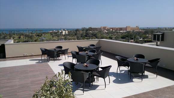 Der Ausblick von der Dachterrasse zum Meer. Hier oben sitzt man ruhig und ungestört. Anbei ist auch eine kleine gemütliche Bar. Mit Blick auf das Meer. Ein kleiner Spaziergang über den Golfplatz und wir waren am Meer.