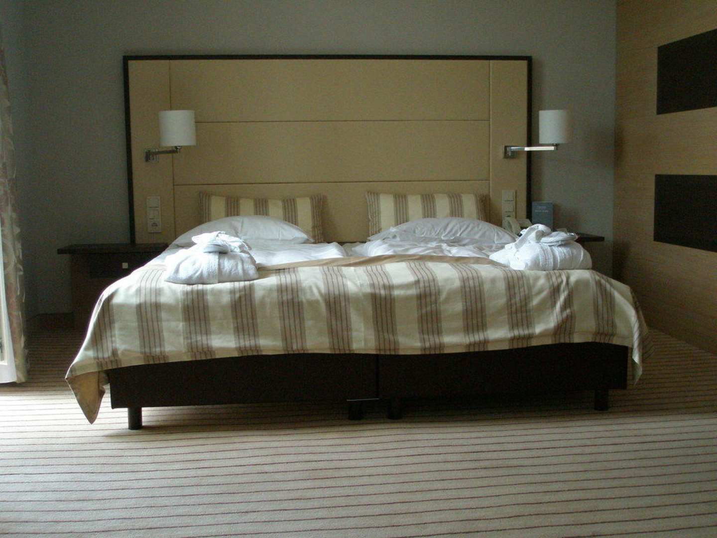 Gute Matrazen, nicht zu weich, rückenfreundlich. Neben dem Bett die Terrassentür. Im Bild nicht zu sehen der schwenkbare Fernseher damit man vom Bett aus fernsehen kann.