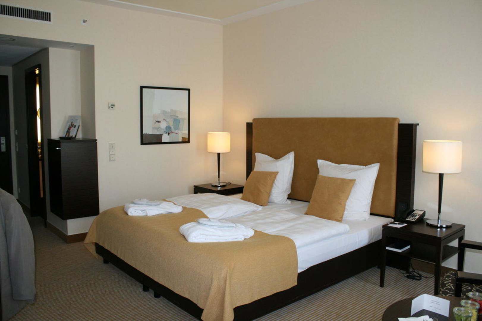 Elegantes Zimmer mit Bademänteln und -schlappen auf den Betten.