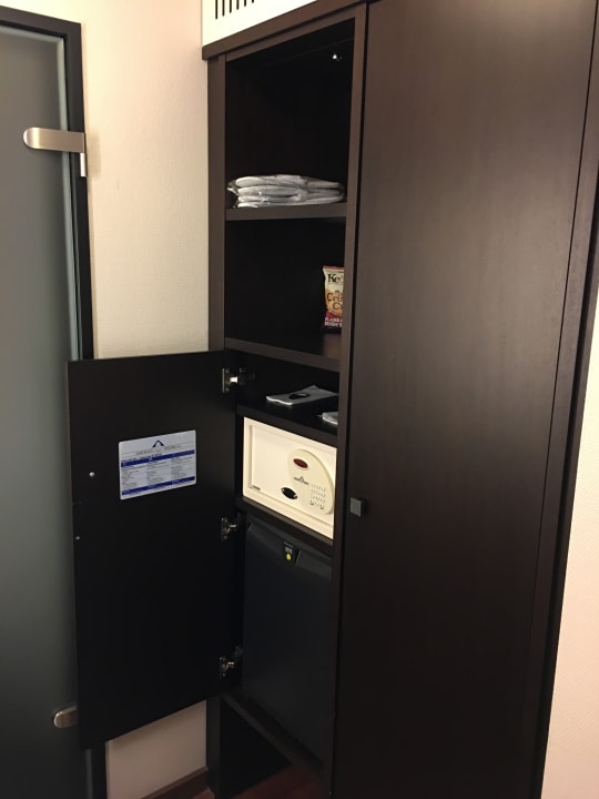 Schrank mit Minibar und Safe. Alles funktionierte.