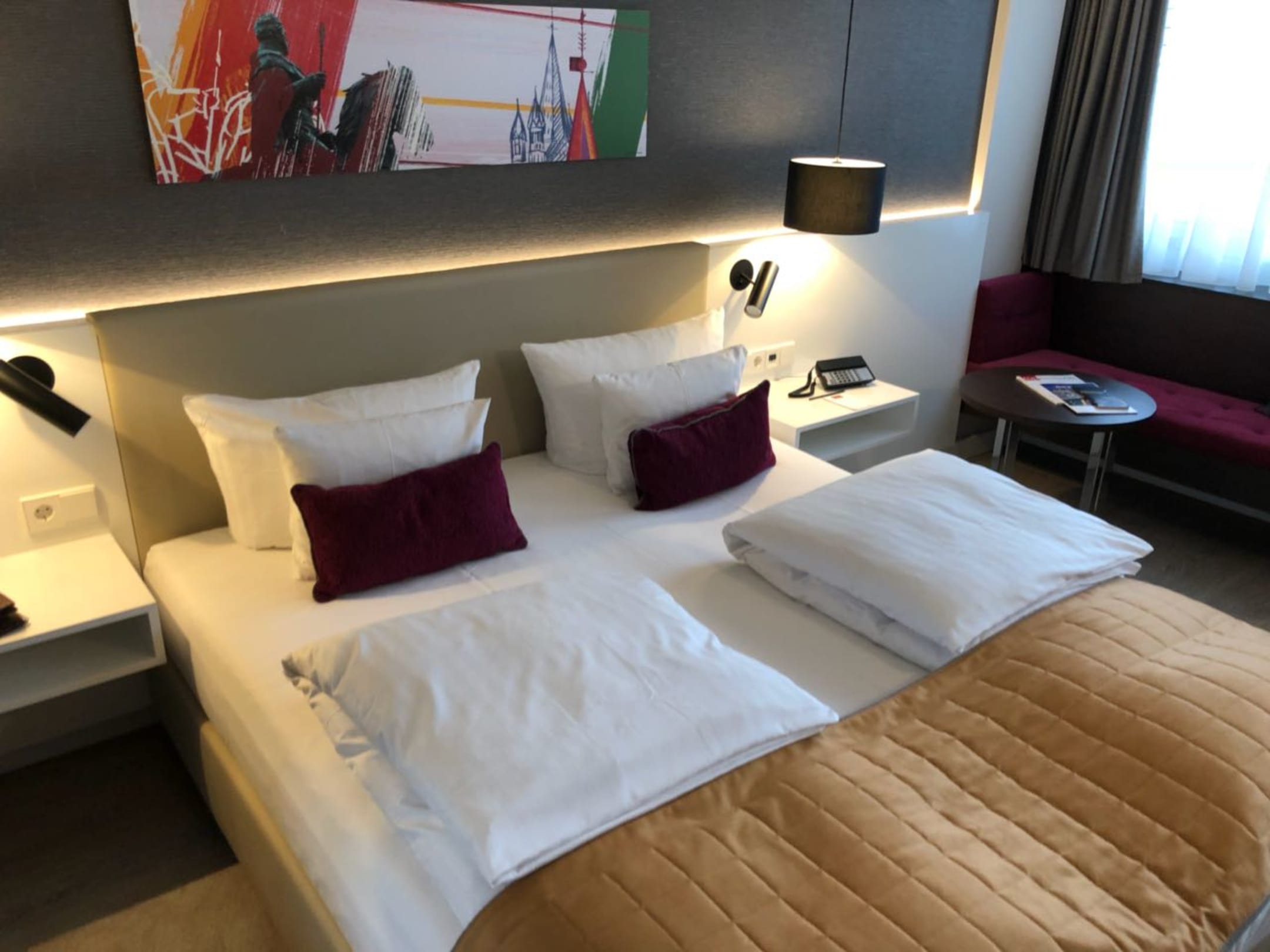 ZimmerWenn man in das Zimmer reinkommt sieht man das schöne Bett. Im hinteren Teil befindet sich das Sofa und rechts vom Eingang das Bad.