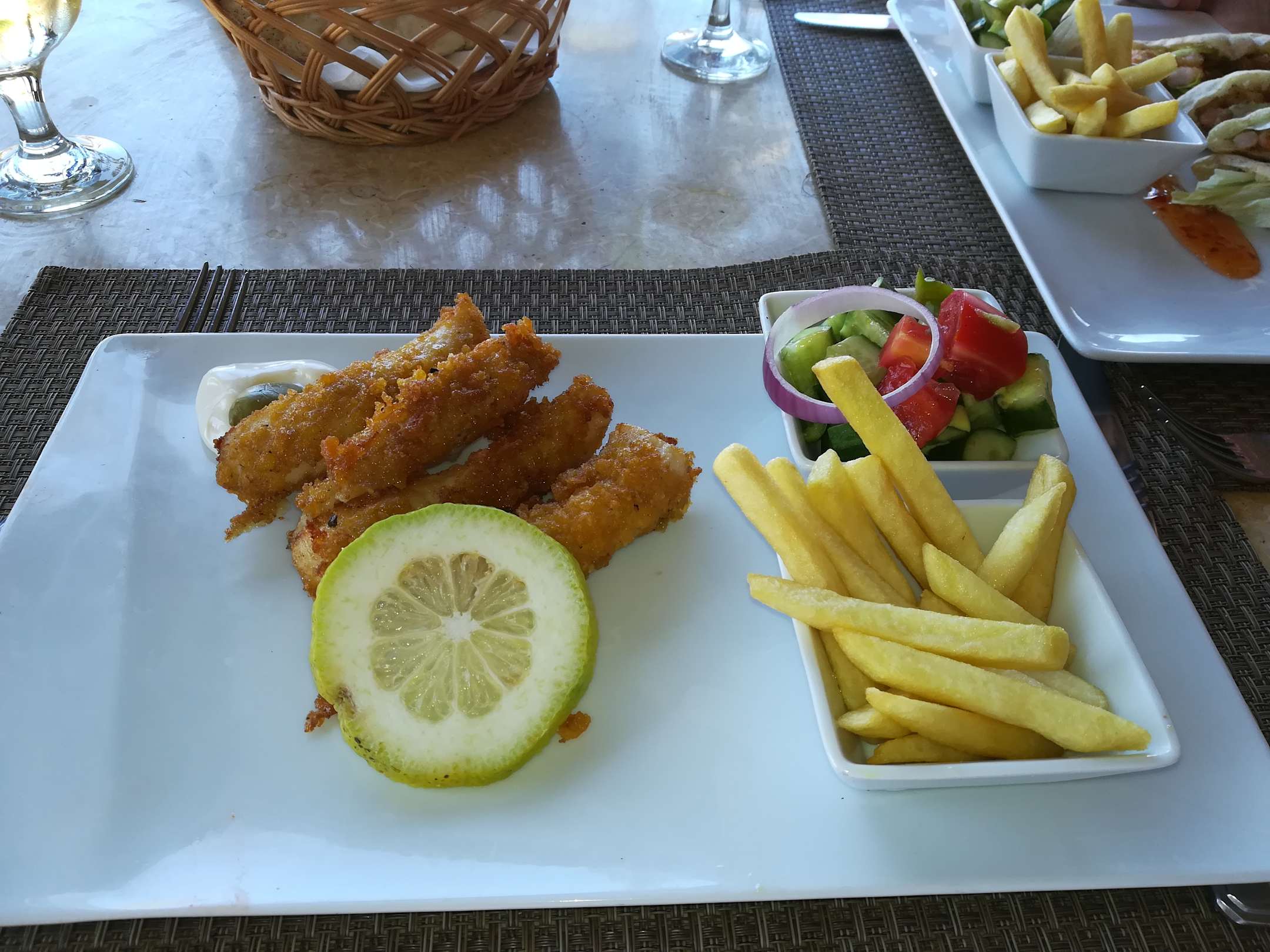 Im Strandrestaurant gibt es hervorragende Menüs wie zum Beispiel Fischfinger mit Salat und Pommes.
