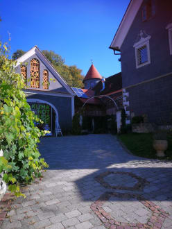 Wie ein kleines Schlösschen mit Giebeln und Türmchen, hier der Innenhof.