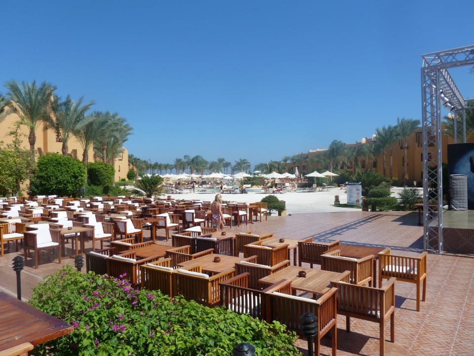 Blick von der Terrasse zu den Pools